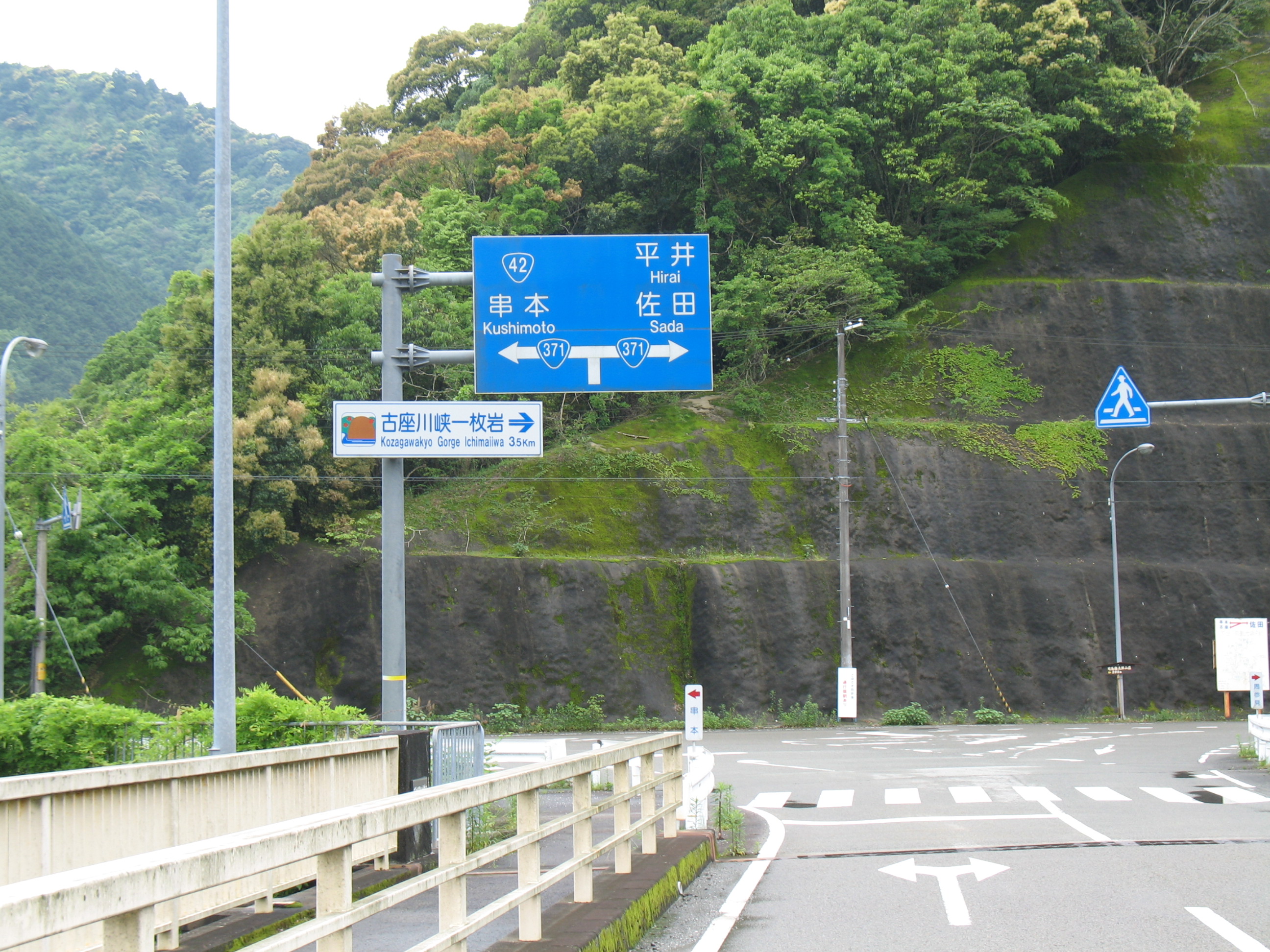 橋を渡って左折,佐田方面に向かいます。ここから国道371号線です。昔は県道だったのに,昭和57年に国道に昇格したそうです。計画によると,大阪府の河内長野市から高野山,龍神を経由して串本に至るルートで,途中何カ所も未開通部分があるため,全線開通はずーっと先のようです。調べてみると,未開通区間は40年前と変わっていませんでした。
