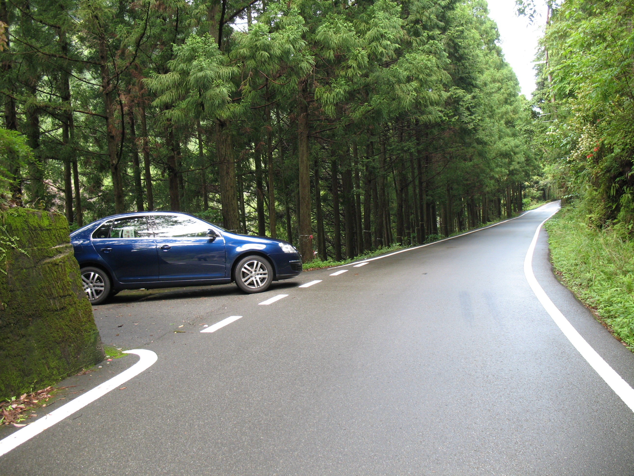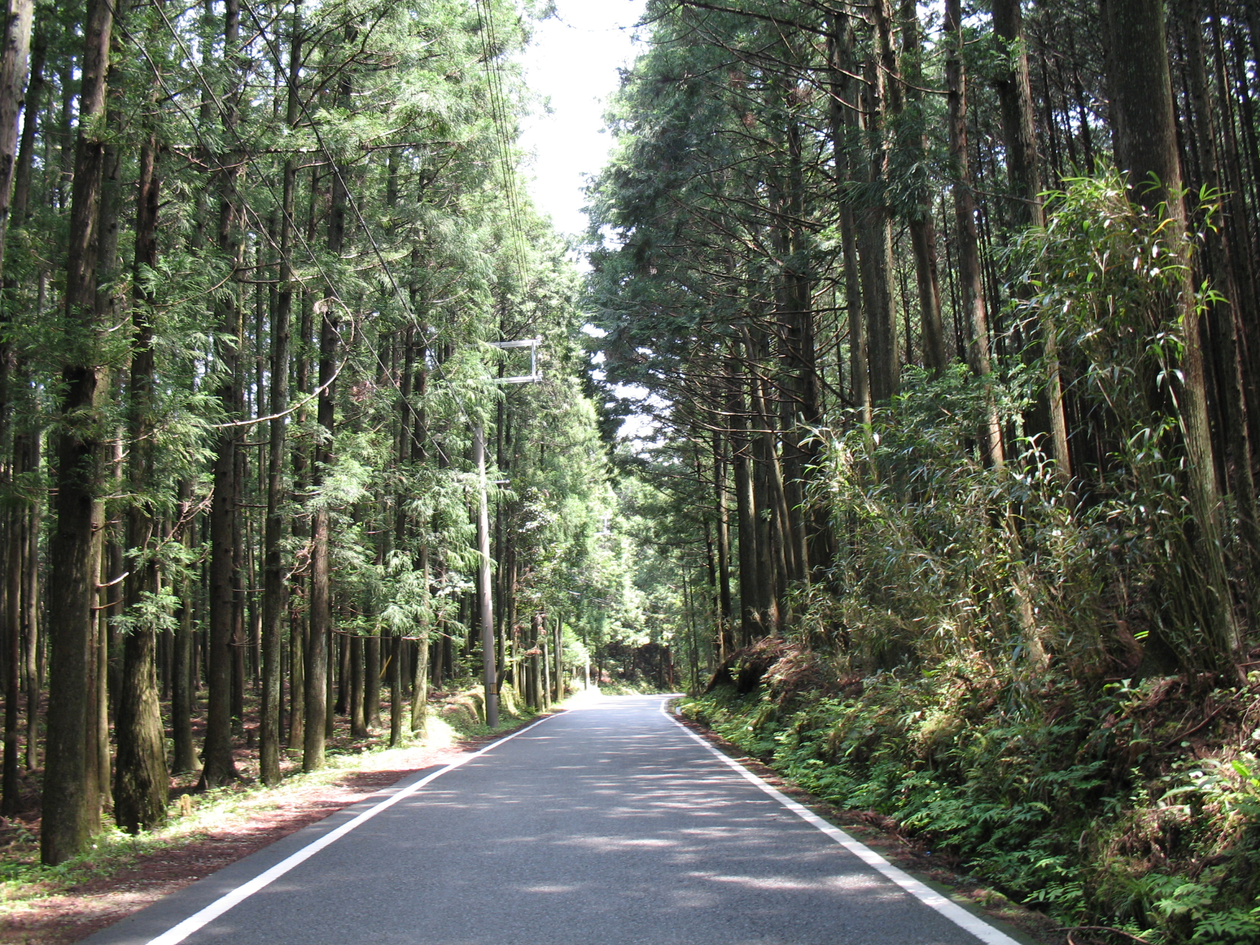 学校から3kmぐらいの地点です。通称「赤土」と呼ばれた,きり通しのところです。ここに家が建っていてビックリしました。かつては,右側が栗林,左側はヒノキを植樹したばかりで,見通しの良いところでした。樹木がうっそうと茂って,昼なお暗き道です。間伐や枝打ちはされていないようです。